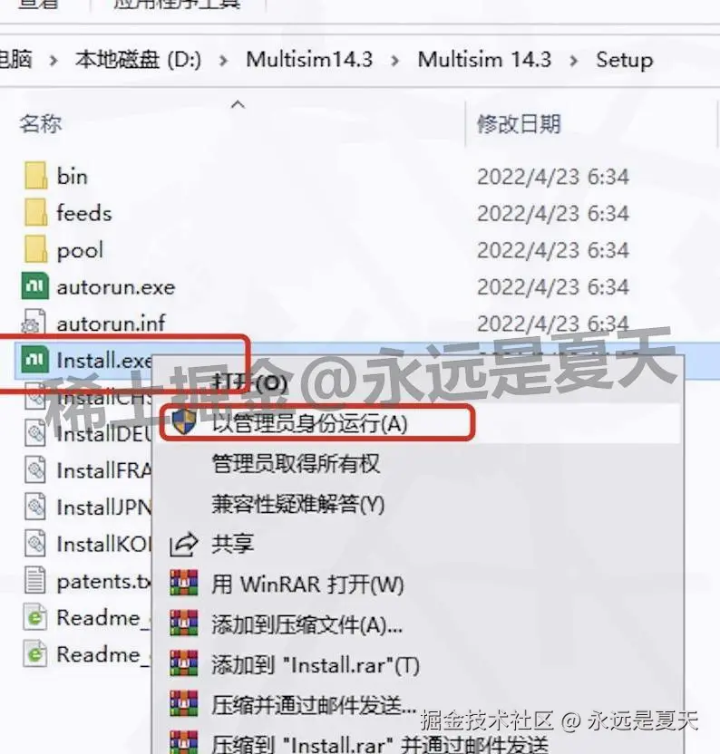在【Setup】里找到 “Install” 程序(图标是小电脑带光盘),右键选 “以管理员身份运行”。