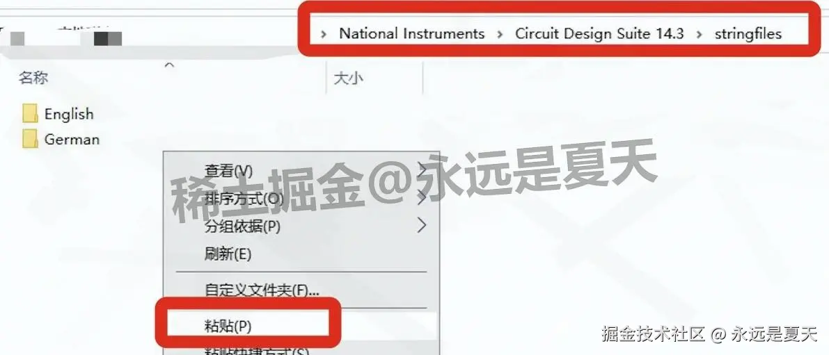 打开路径 “C:\Program Files (x86)\National Instruments\Circuit Design Suite 14.3\stringfiles”,在空白处右键 “粘贴”,选 “替换目标中的文件”。