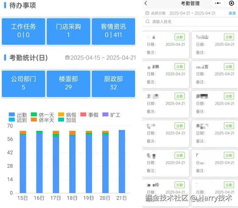 - 考勤记录:记录员工的在岗、休息、请假等信息。系统会根据预设的规则自动生成考勤报表,方便管理者随时查看和审核。