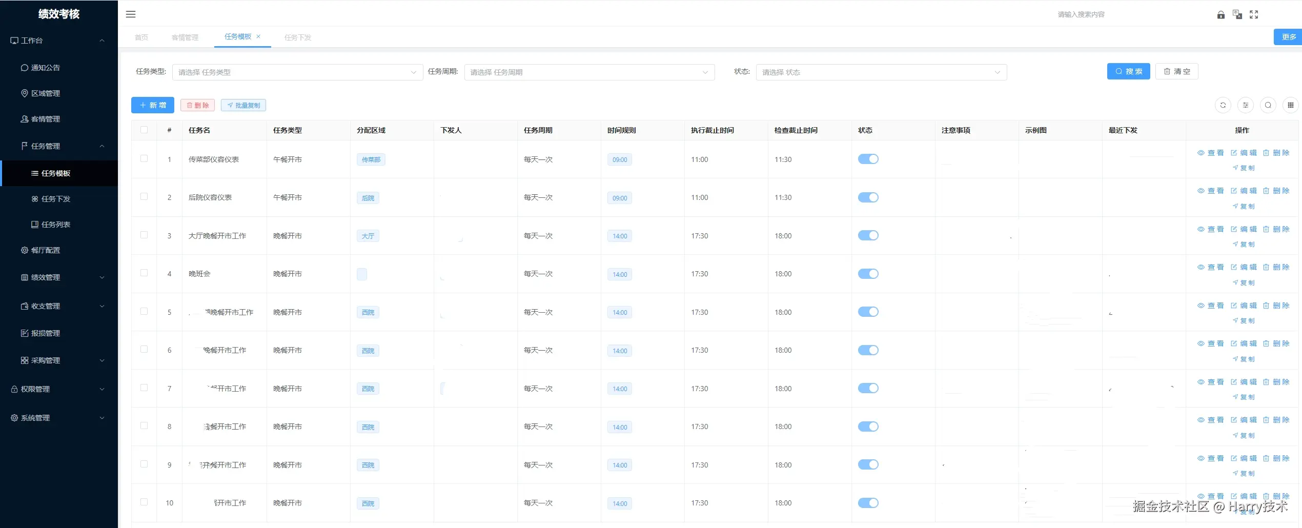 - 模板任务下发:系统提供了模板任务下发的功能,管理者可以通过设置任务模板将任务按照时间规则下发到店长账号下,然后有任务将任务分配给相应负责人。