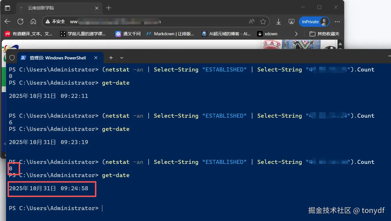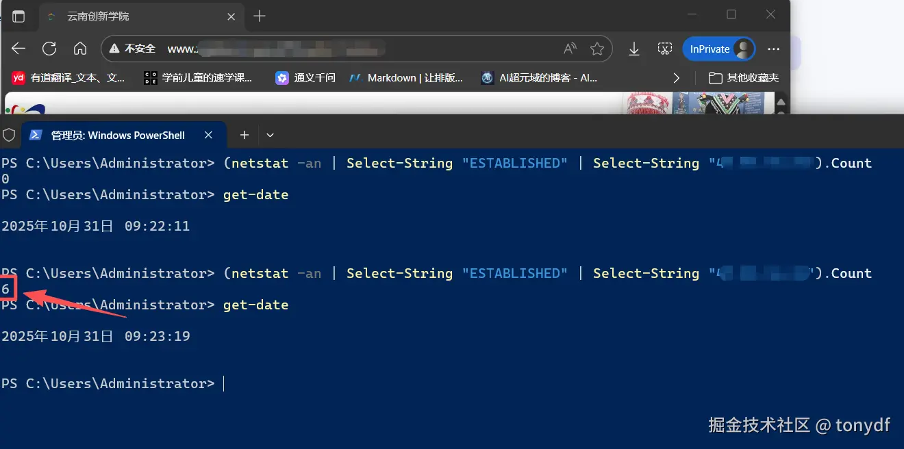 - 接着,打开浏览器访问站点后,再次重复上面命令,可以看到建立了6个tcp连接