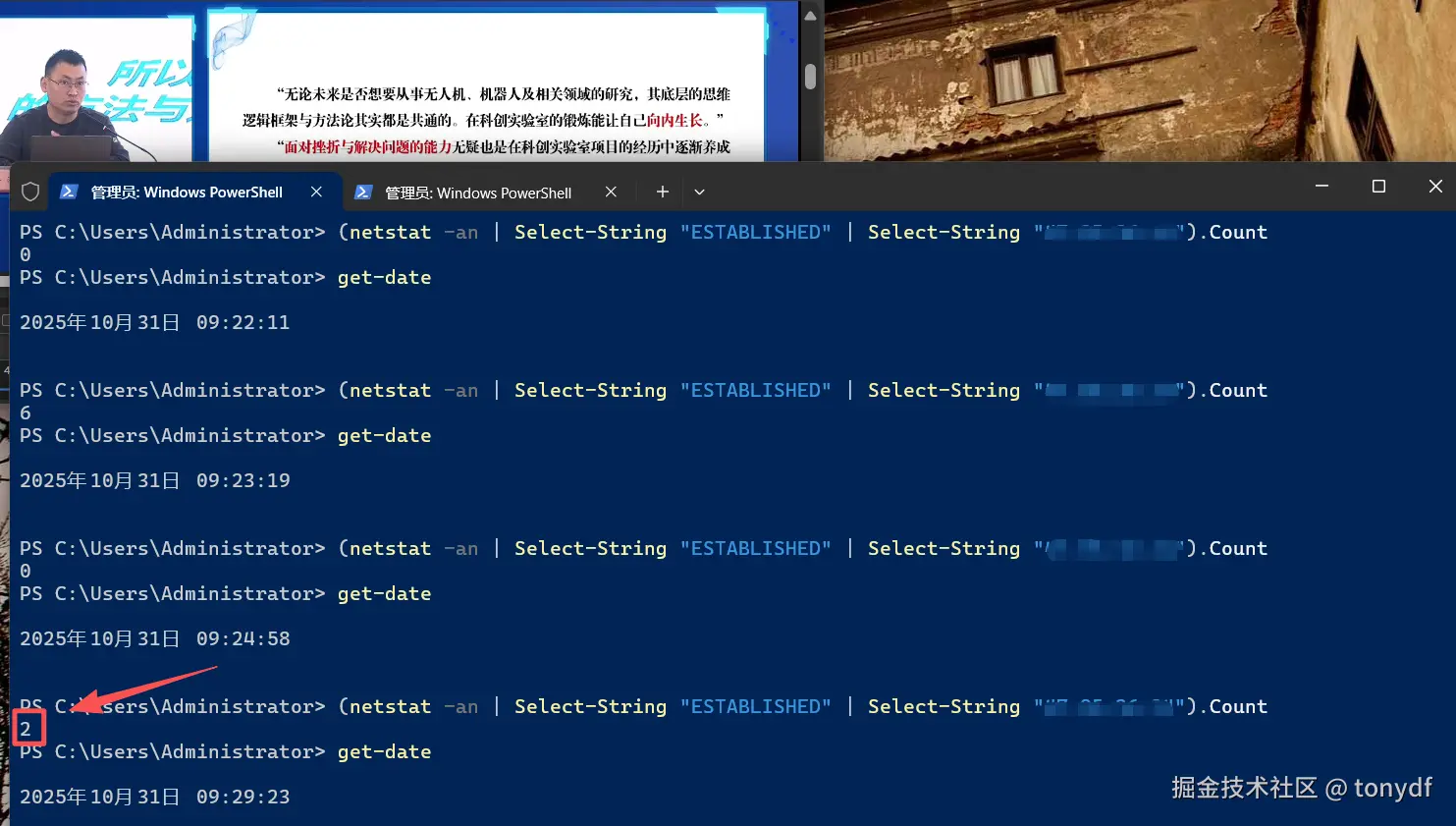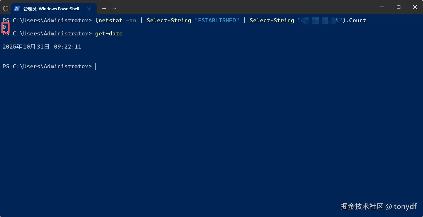 - 然后通过netstat命令看一下目前和当前服务器ip有没有建立tcp连接