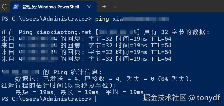 - 开始之前,先ping一下域名,确定我们请求的域名公网ip是什么(注意,前提是服务器允许ping,为了测试,可以先临时放开一下)