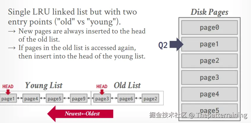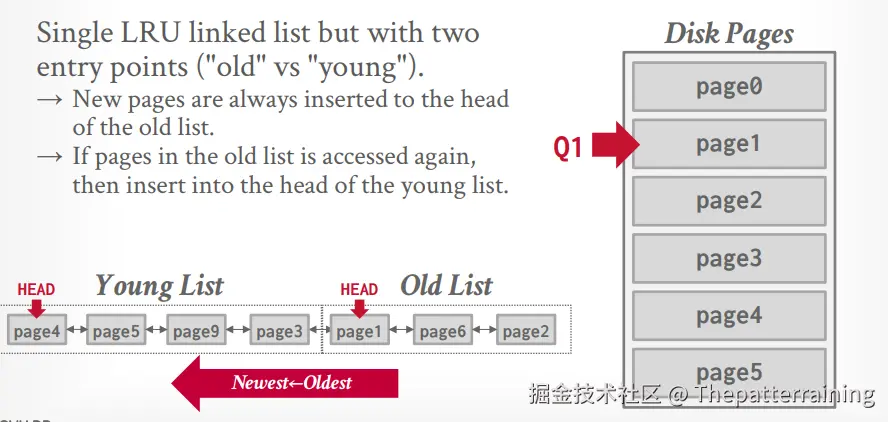 相当于K=2。有一个LRU List,但是有两个指针,分别表示old list和young list。当数据第一次被访问的时候放到old list中,再次被访问的时候放到young list中。