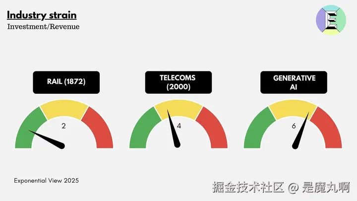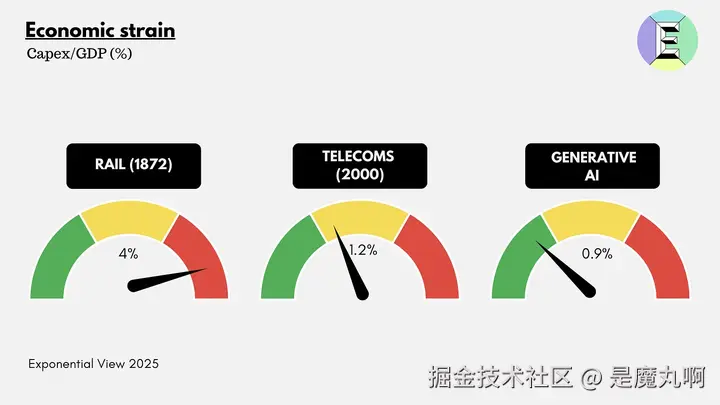 在美国铁路扩张的高峰期1872年,capex约为收入的2倍。在1990年代末的电信泡沫中,capex相当于收入的近4倍。相比之下,今天的生成式AI繁荣在大约600亿美元的收入对抗大约3700亿美元的全球数据中心capex上运行——capex与收入比率为6倍,是三个中最紧张的。