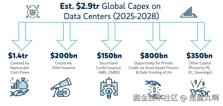 在这方面,今天的AI繁荣看起来更坚固。微软、亚马逊、Alphabet、Meta和Nvidia正在创造非凡的现金流,足以资助自己的建设。目前。但投资需求正在快速前进。摩根士丹利认为2025年到2028年间全球数据中心capex总额将达到2.9万亿美元。超大规模云服务商可以从内部现金覆盖其中约一半。其余必须来自私人信贷、证券化金融和新运营商。政府也已承诺1.6万亿美元主权AI投资,海湾资本正在寻求新机会。