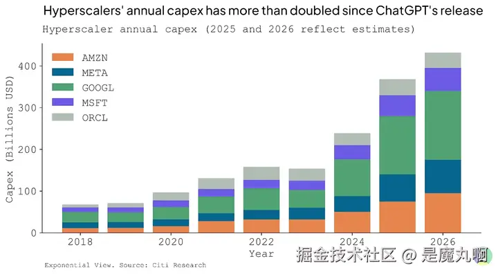 这把我们带到了当前的问题:AI是另一个泡沫吗?让许多观察者不安的是数字。自ChatGPT在2022年底发布以来,超大规模云服务商将其年度数据中心资本支出增加了一倍多,大量投资于训练和运行越来越大模型所需的基础设施。当Sam Altman去年提出7万亿美元的投资需求时,听起来像是狂妄自大。今天,投资者们不再笑了;他们在思考这种支出规模是否可持续。