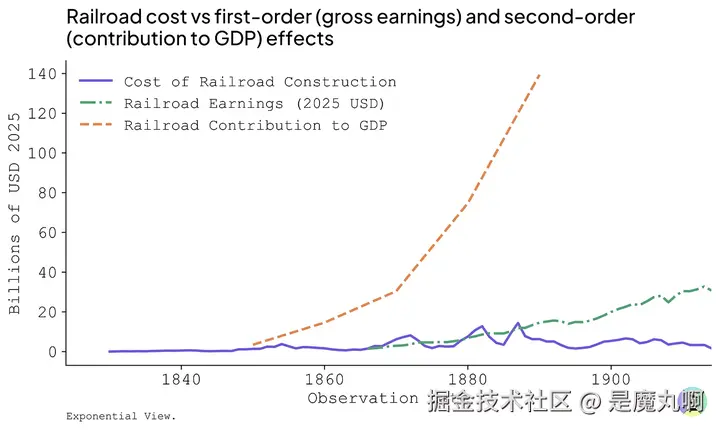 6 见前一个脚注关于生成式AI收入模型。铁路从FRED数据计算,电信从美国租赁线路收入的OECD数据计算。