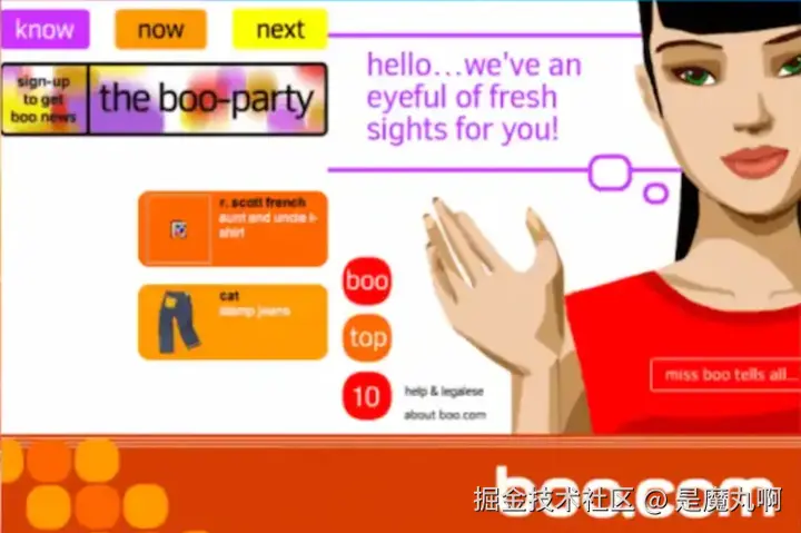 它在发布前在广告上花费了2500万美元,员工从40人膨胀到400人,在纽约和欧洲各地开设了豪华办公室。JavaScript和Flash沉重的网站在拨号连接上几乎不可用,与Mac计算机不兼容且有错误。四分之一的购买尝试失败。尽管奢侈——豪华派对、协和飞机航班和Miss Boo的名人造型师——但民意调查显示只有13%的互联网用户知道这个品牌存在。18个月内,钱没了。Boo.com在2000年5月崩溃了。