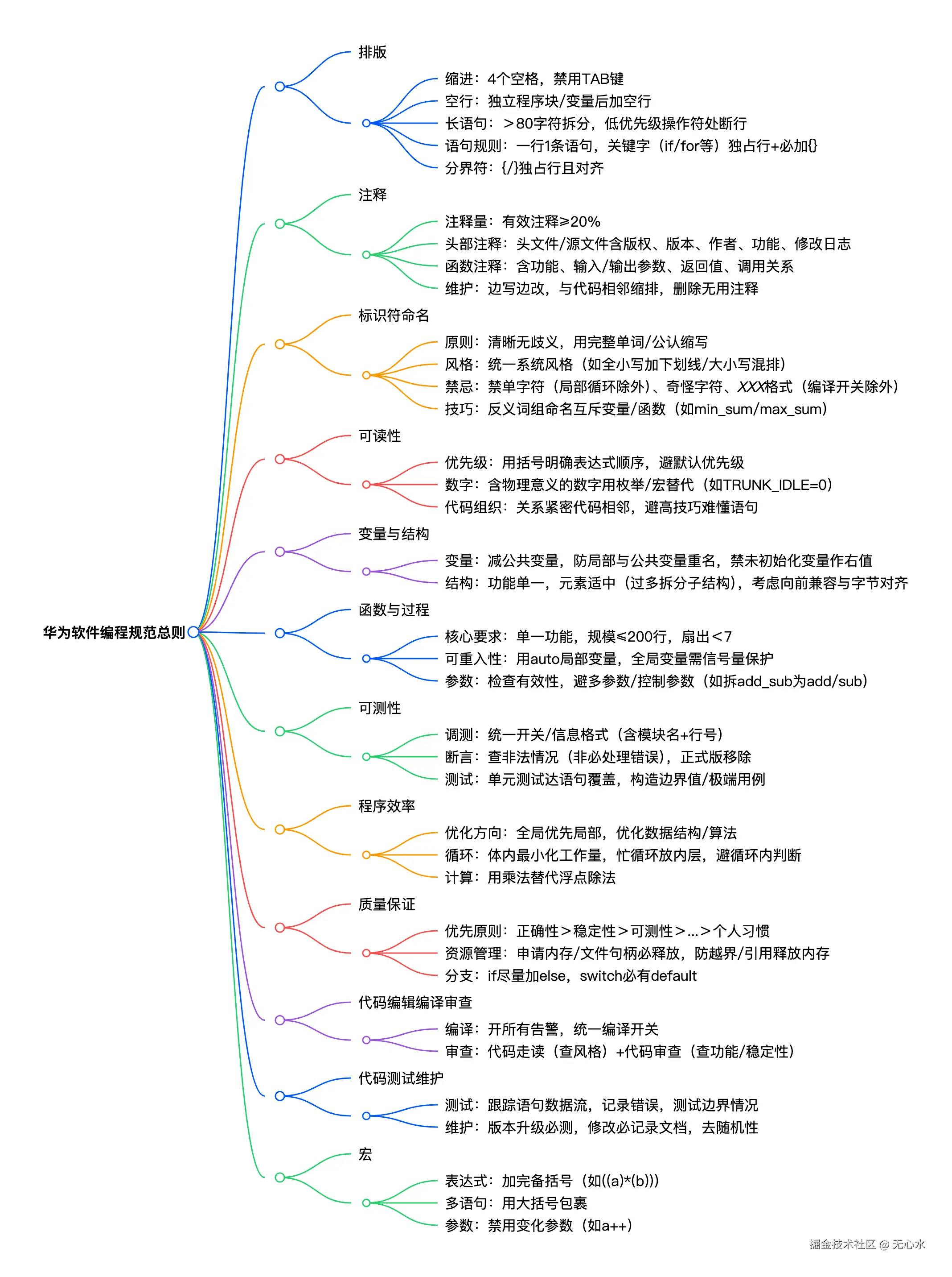 某为内部软件编程规范总则围绕排版、注释、标识符命名、可读性、变量与结构、函数与过程、可测性、程序效率、质量保证、代码编辑编译审查、代码测试维护、宏12大核心领域制定规范,明确排版需4空格缩进、一行仅一条语句,注释有效量需≥20% 且头文件/源文件/函数需包含版权、功能、修改日志等指定信息,标识符命名需清晰无歧义(局部循环变量外禁单字符),函数需单一功能且扇出≤7,同时通过“正确性>稳定性>可测性”的质量优先原则、断言提升可测性、循环优化提高效率,最终确保代码规范、可读、可维护且适配多场景需求。