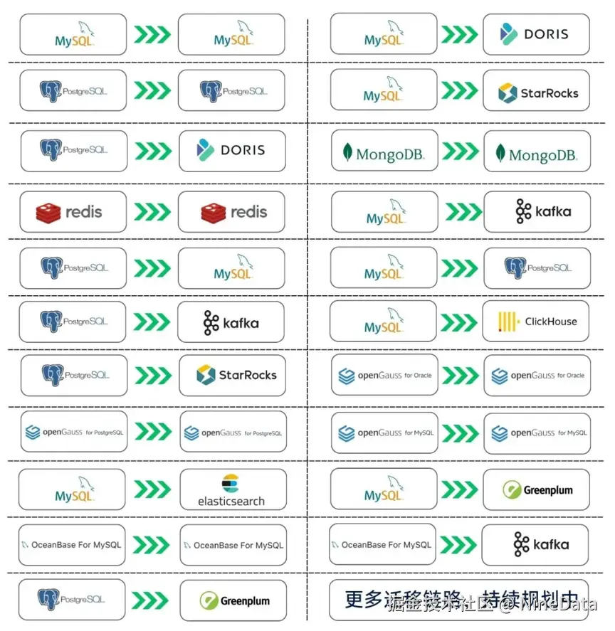 NineData 社区版 V4.6.0 已支持 21 条数据库迁移链路,如下:
