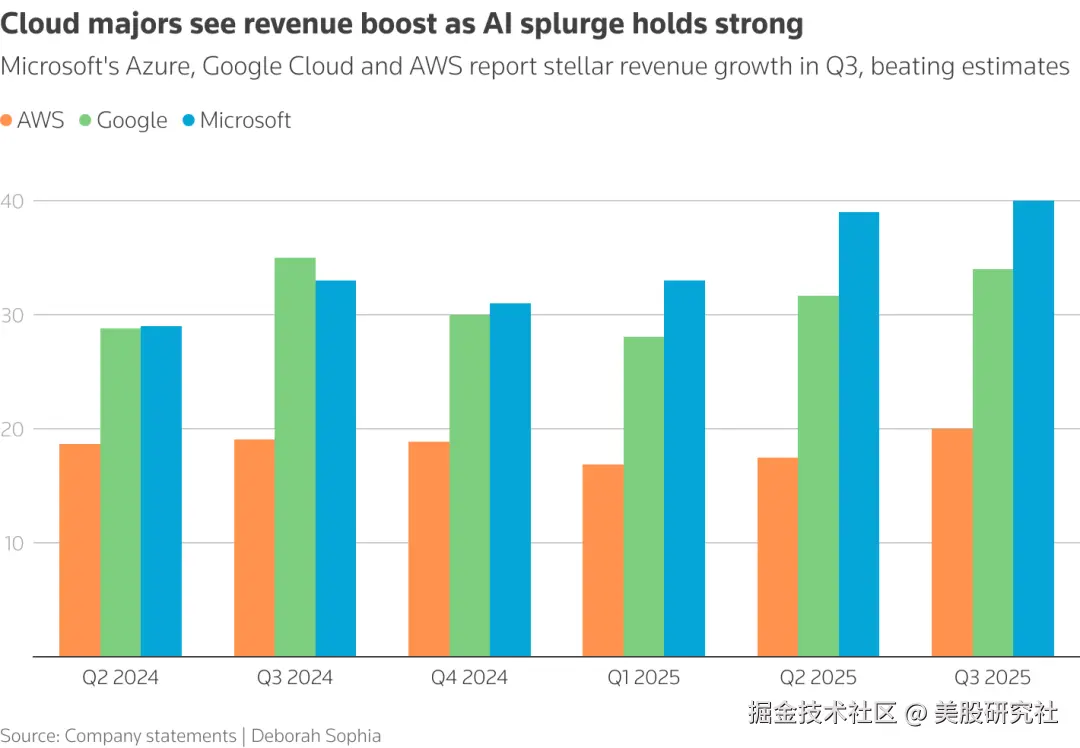 作为全球最大的云服务提供商,AWS本季度的强劲表现,紧随微软(Microsoft)和谷歌(Google)此前公布的亮眼业绩之后。微软旗下的Azure和谷歌云(Google Cloud)分别位列行业第二、第三,两者在周三均报告了出色的云业务增长。