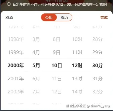 - 默认公历:2000年5月10日 12点30分钟