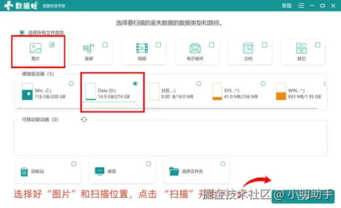 步骤1: 打开软件就能进入到“扫描准备页面”,在上面勾选“图片”,下面勾选丢失照片的位置(也可以直接扫描外部存储设备),选择好后点击“扫描”按钮,开启下一步;