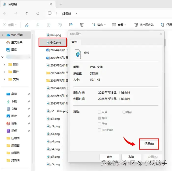 步骤2: 在文件详细窗口中点击“还原”按钮,让照片恢复到原来的位置上。
