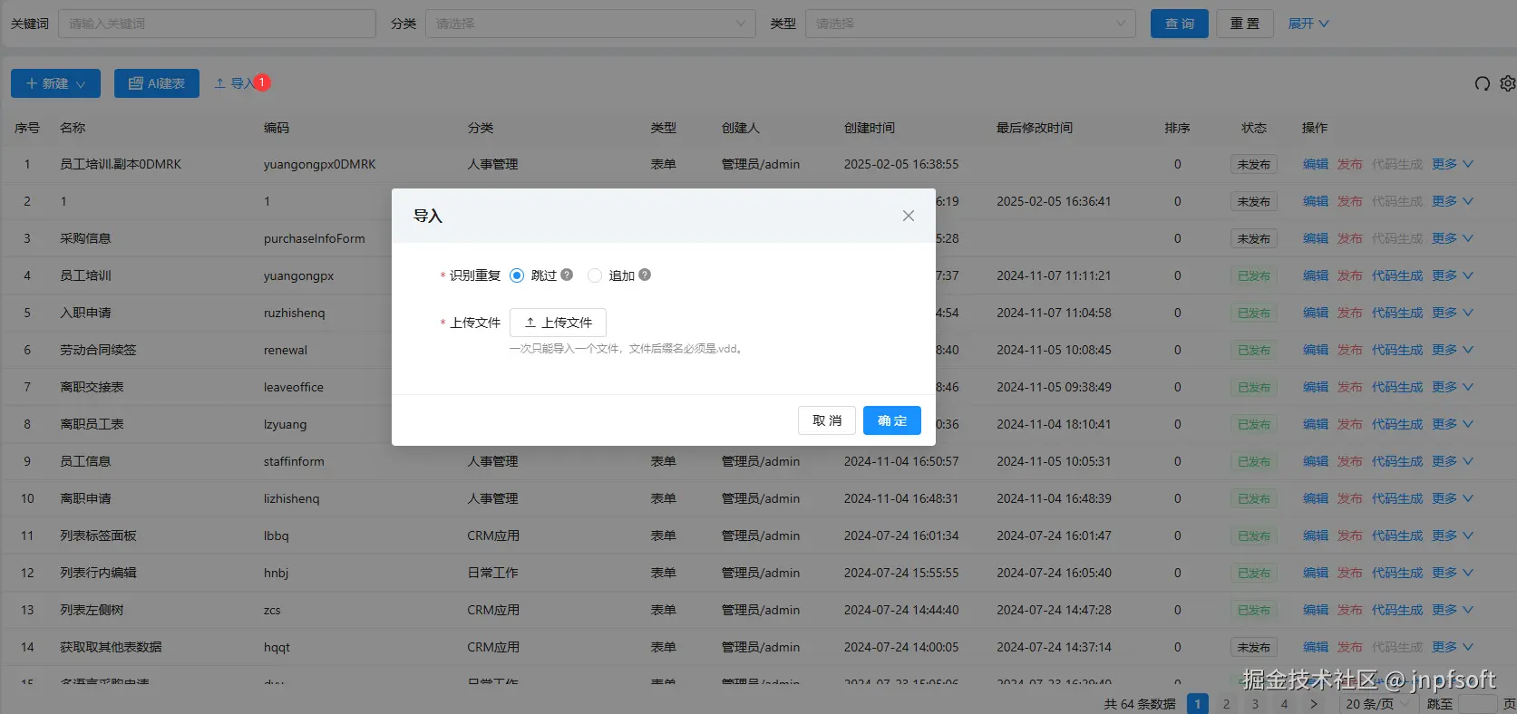 • 导入表单:上传.vdd 格式文件恢复表单,需注意 2 点:仅支持.vdd 格式,其他格式提示 “请选择.vdd 类型的文件”;识别重复规则:跳过:数据已存在则提示判重,不导入;追加:数据已存在则生成副本(名称 / 编码加随机码),新增记录。