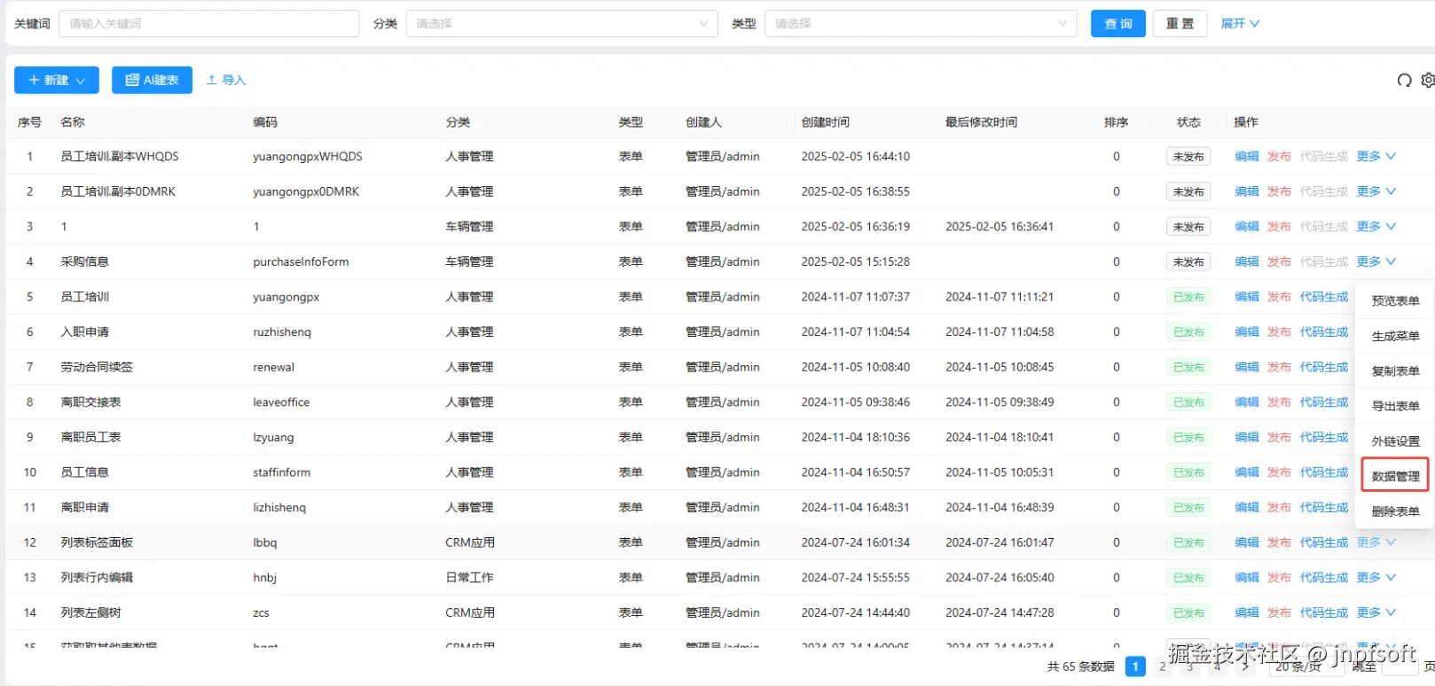 • 数据管理:仅 “已发布且启用列表” 的表单可用,点击后新页签展示表单数据列表,支持编辑、删除、详情查看,数据展示规则与列表设计一致(字段、按钮配置)。避坑:不支持流程表单,仅展示功能表单数据,且高级查询不支持保存方案。