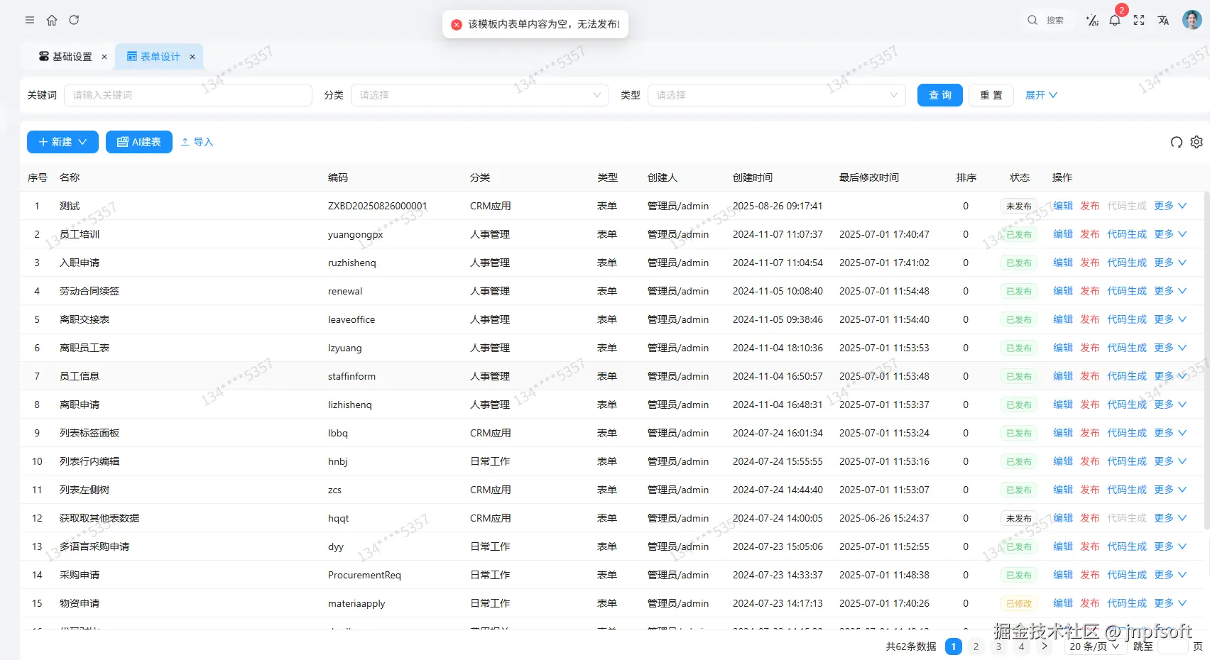• 编辑:进入表单设计页,可修改基础设置、控件配置和列表设计;未发布表单直接保存,已发布表单修改后状态变为 “已修改”,需重新发布生效。避坑:编辑后需确保表单设计和列表设计非空,否则无法发布。