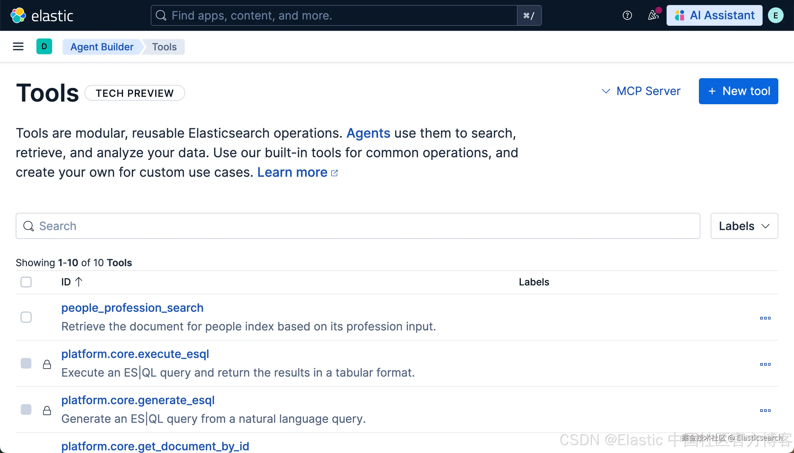 我们可以再使用上面的 GET kbn://api/agent_builder/tools 命令来查看 find_average_age 已经被删除。我们也可以在界面中查看:
