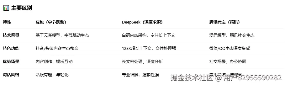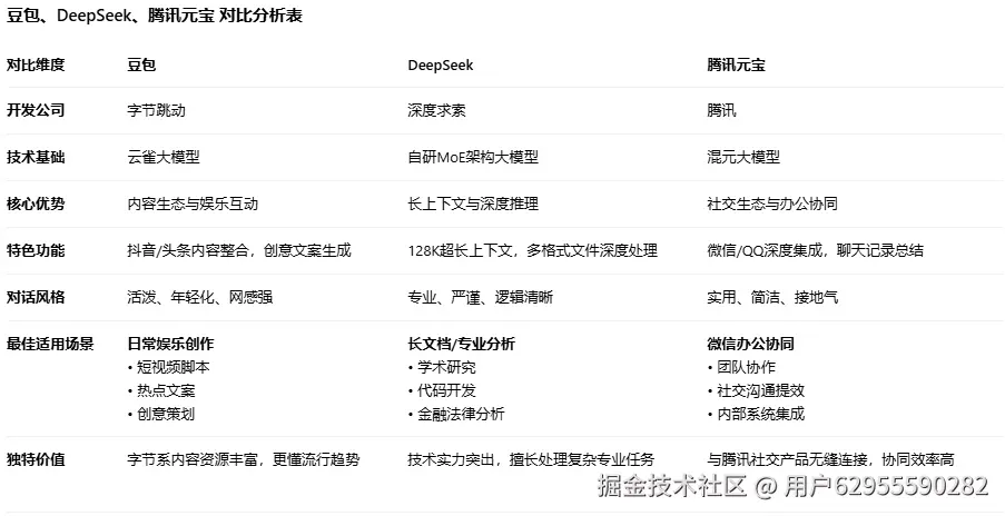 | 维度 | 豆包 | DeepSeek | 腾讯元宝 |