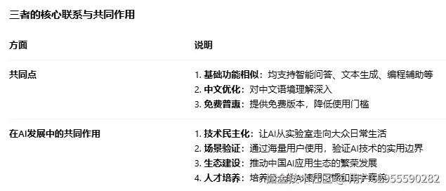 功能相似性:三者都具备现代AI助手的基础能力,如智能问答、文本创作(写文案、邮件、剧本)、总结归纳、翻译、编程辅助等。