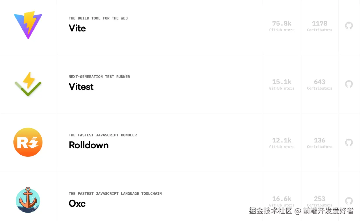 | Oxc | 解析器 / Linter / Formatter / Transformer | 比 ESLint 快 50~100 倍 |