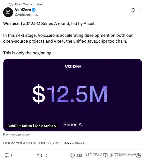 由 Vite 作者尤雨溪(Evan You)创立的 VoidZero Inc. 宣布完成 1250 万美元 A 轮融资,由全球顶级风投 Accel 领投。