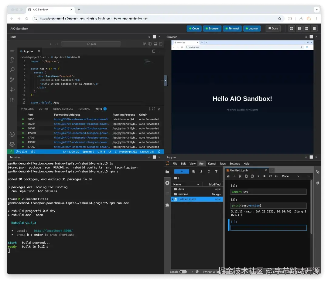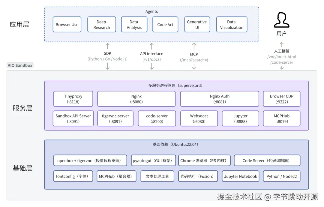 一句话介绍:AIO Sandbox 在一个沙盒内集成浏览器、代码执行、终端、可视化接管、正反向代理、MCP、鉴权等基础功能,可根据需求进行沙盒环境定制,让不同的 Agent“在一个环境容器内中更高效地完成任务”。