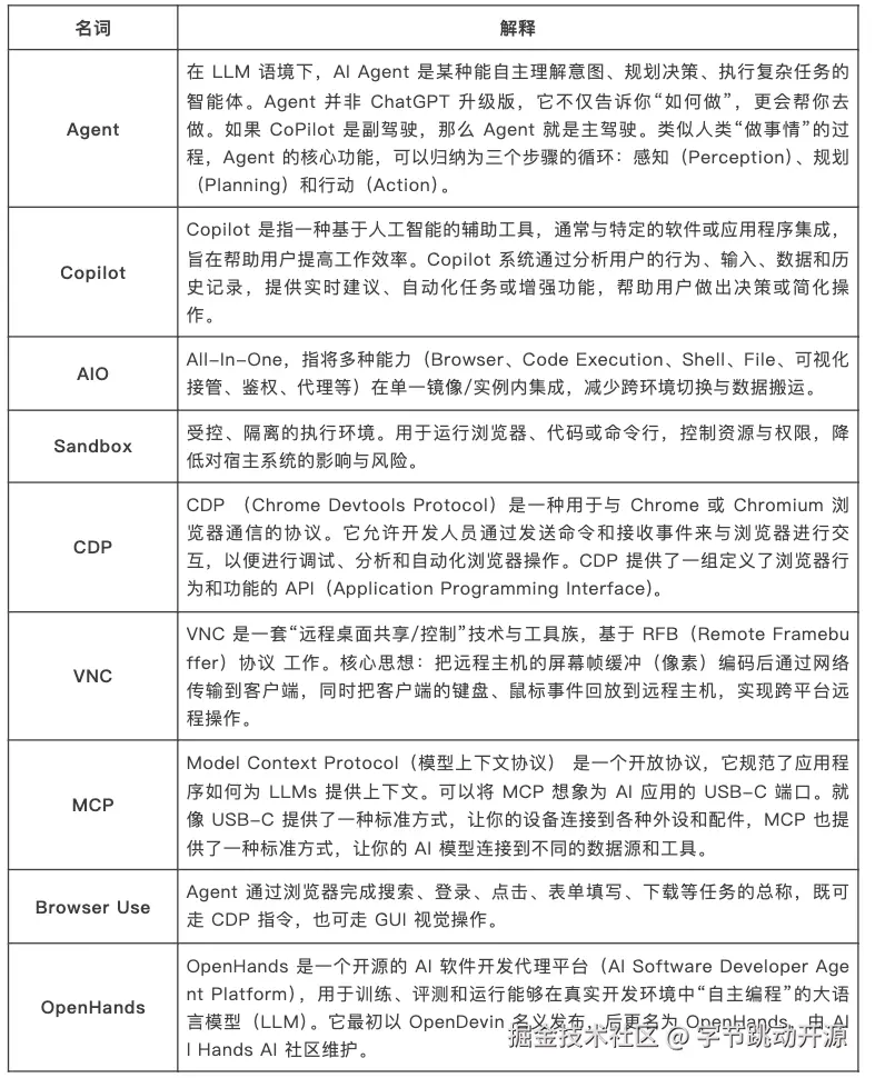 面向 Agent 的浏览器环境,核心在于提供出 CDP 和 VNC,主流 Browser Use 框架都可以直接使用; AIO 提供了基于 x11 的浏览器 GUI 视觉操作接口,可以与 CDP 方式组合出更高效、更低风控率的 Browser Use 方案。