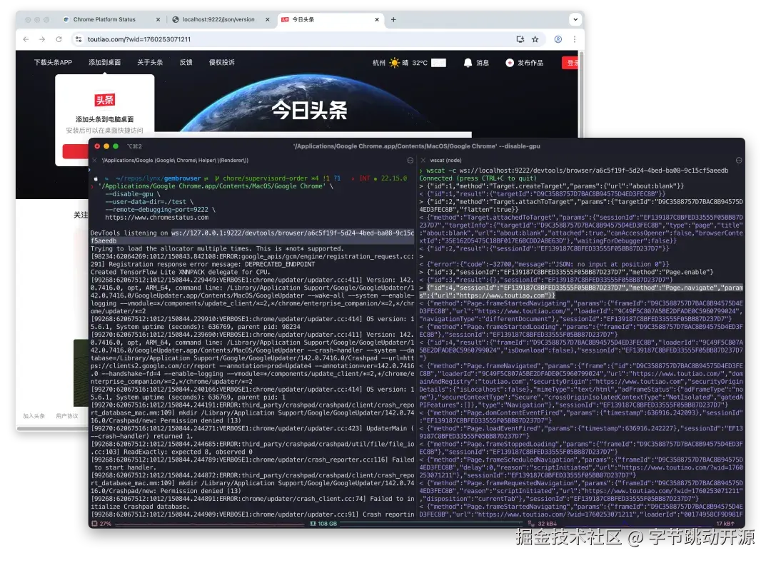 CDP (Chrome Devtools Protocol)是一种用于与 Chrome 或 Chromium 浏览器通信的协议,通过 WebSocket 提供浏览器控制 API,可以执行导航与加载、DOM 操作、JS 执行/调试、网络拦截与模拟、截图与渲染、安全与权限等。 为更直观了解,以下示例是用 CDP 发起一个 navigate 页面导航指令:
