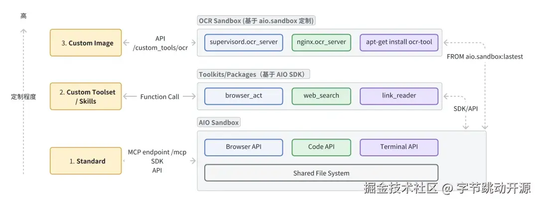 AIO Sandbox 面向 Agent 提供 Browser、File、Shell、Code 等基础能力,提供可扩展性支持开发者根据 Agent 需求组合与定制专属沙箱(如 AIO Sandbox for 移动端/医疗/法务/金融/科研)。 沙箱定制程度依次递增: