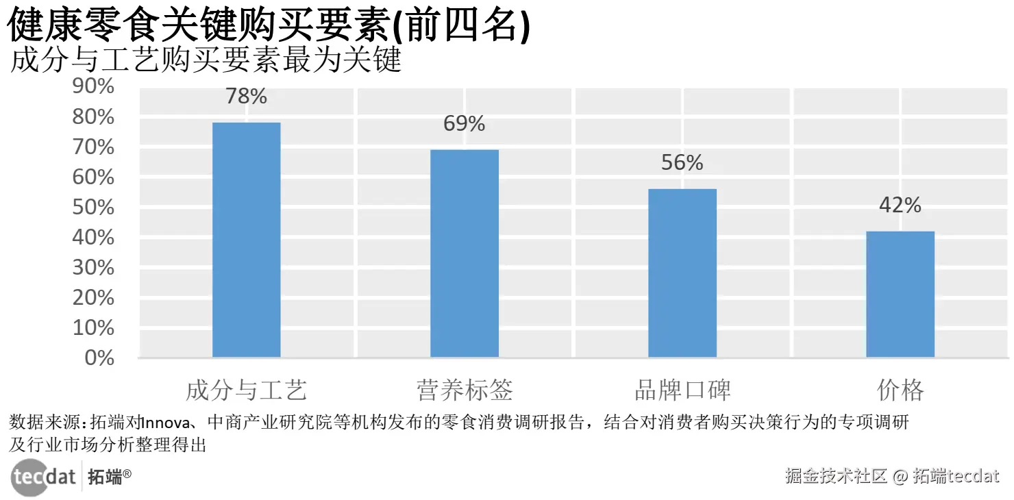 - 关键购买要素:78%优先关注“配料表简洁度+制作工艺(如非油炸)”,69%查看“能量、脂肪、钠含量”等营养数据,56%倾向“有报告背书、评价好的品牌”,42%对比“单价与规格”,性价比仍是重要考量。