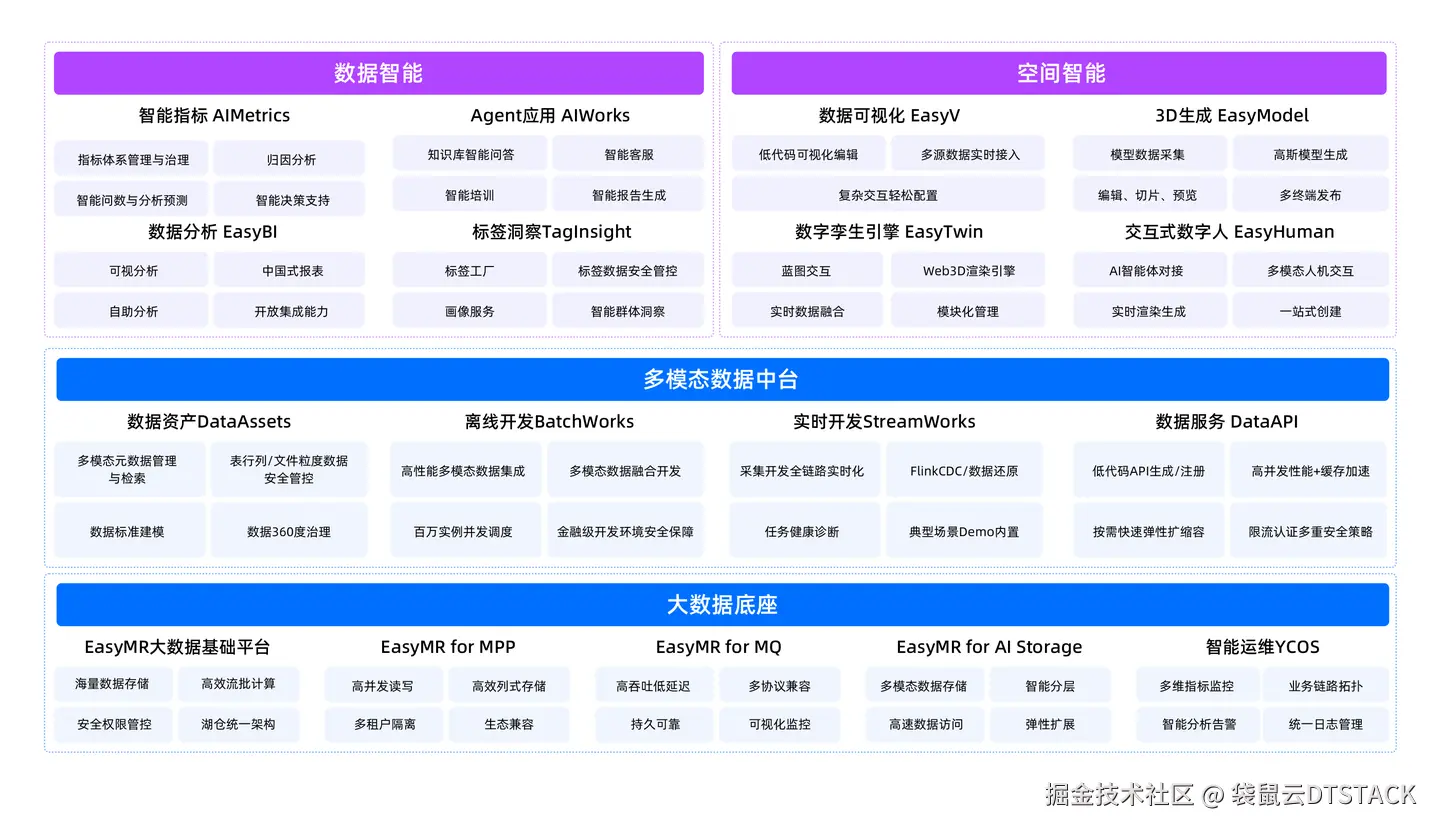 “一体” 是袋鼠云过去十年磨一剑的核心能力基座 —— 数栈・多模态数据智能中台,主要分为两层:大数据基础底座平台 EasyMR 和 多模态数据中台 DataZen。 这完美承接了新质生产力对“数据基座”的刚性要求:它既能稳稳接住结构化数据的“高可信”治理与建模,又补上了非结构化数据的“全模态”治理短板。这是企业通向 AI 时代的“数据筑基工程”。