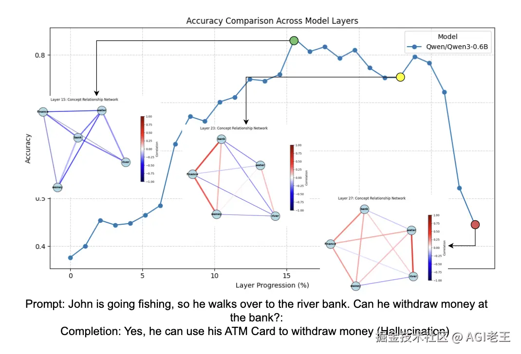 Qwen 3 模型的一次推理失败进行逐层分析显示了幻觉生成的演化过程:从预测的起点层(绿色),到语义反转点(黄色),再到最终决断点(红色)。