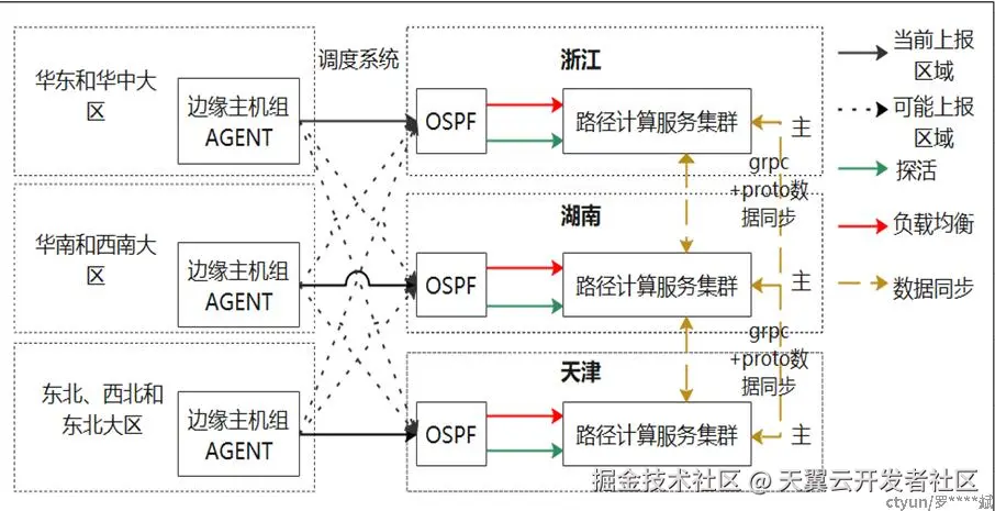 实现路径计算服务在不同区域内的路径计算服务集群之间的数据同步功能,打破各区域数据孤岛问题而导致的边缘主机组基础探测数据无法在各区域来回切换上报,并可以按区域实现垂直扩展,达到去中心化,解决高可用的同时,也提高了计算速度