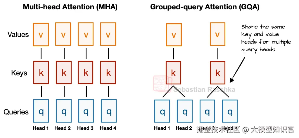 MHA 与 GQA 的对比。此处组大小为 2,即每组键值被 2 个查询头共享。