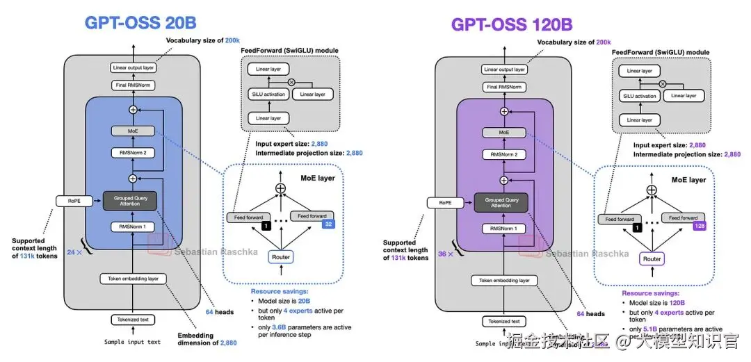 值得注意的是 gpt-oss 的专家数量 surprisingly 少(32 个而非 128 个),且每 token 仅激活 4 个(而非 8 个)。但每个专家规模远大于 Qwen3 的专家。