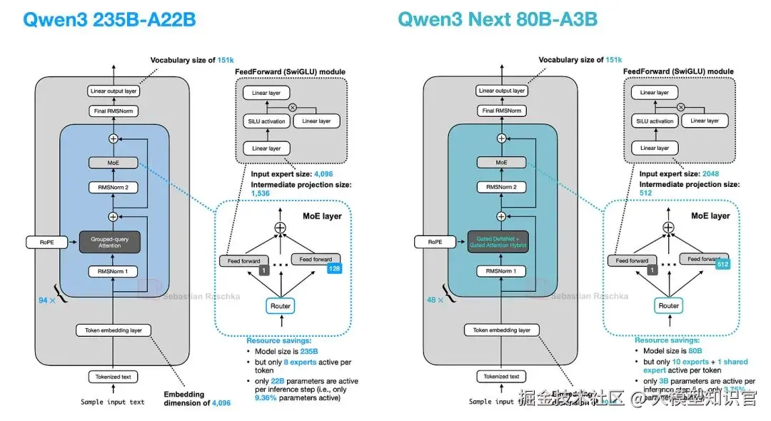 5 月份发布的原始 Qwen3 模型(左)与 9 月份发布的 Qwen3 Next 模型(右)