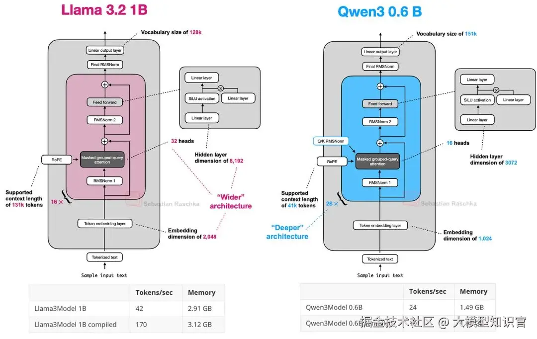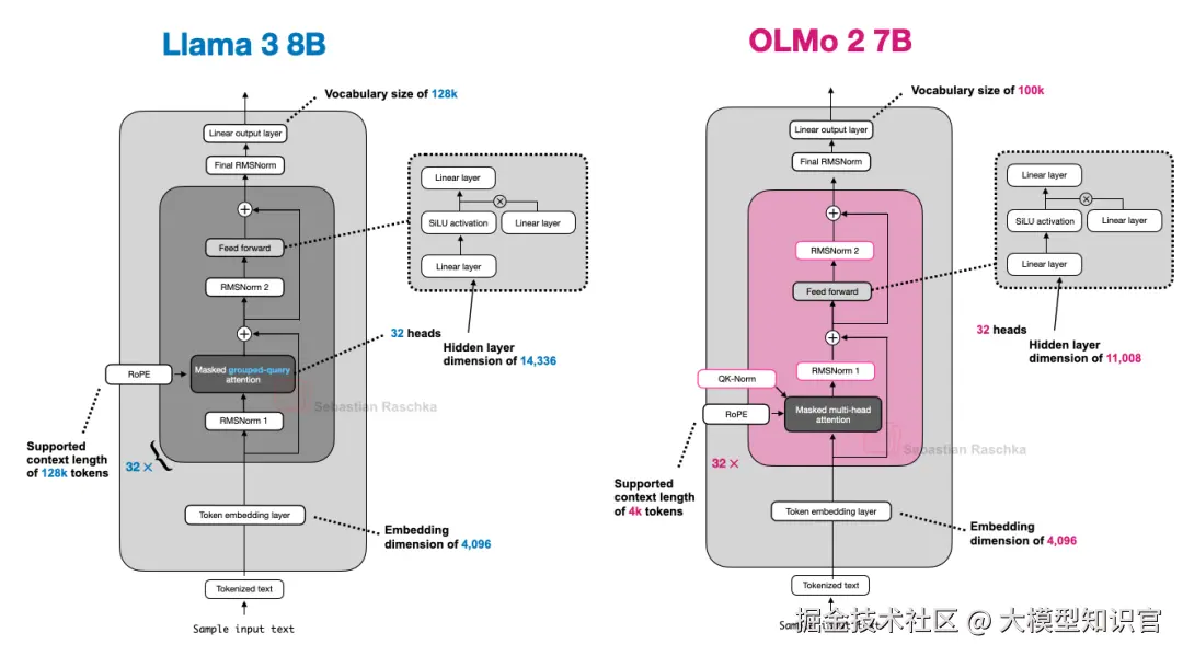 下图进一步将 OLMo 2 与 Llama 3 进行对比;可见,除 OLMo 2 仍使用传统 MHA(而非 GQA)外,两者架构相对相似。(不过,OLMo 2 团队三个月后发布了使用 GQA 的 32B 变体。)