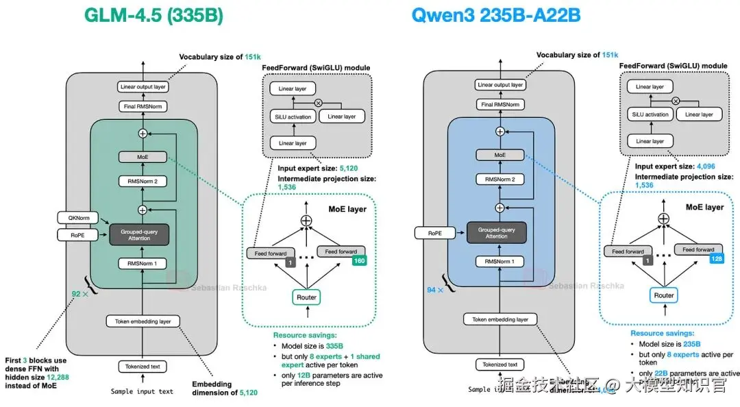 此外,GLM-4.5 使用了类似 DeepSeek-V3 的共享专家(与 Qwen3 不同)。