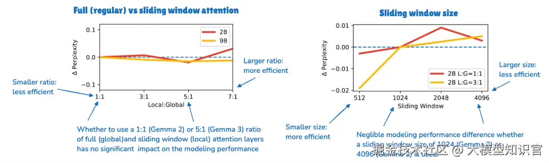 Gemma 2 在每隔一层使用滑动窗口注意力,而 Gemma 3 将比例调整为 5:1,即每 5 个滑动窗口(局部)注意力层才配 1 个完整注意力层;此外,滑动窗口大小从 Gemma 2 的 4096 缩减至仅 1024。这使模型更侧重高效、局部的计算。