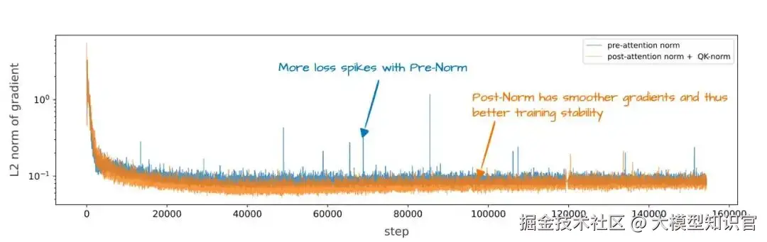 遗憾的是,该图同时展示了层重排与 QK-Norm 的效果,后者是另一个独立概念。因此,很难单独评估归一化层重排本身的贡献。