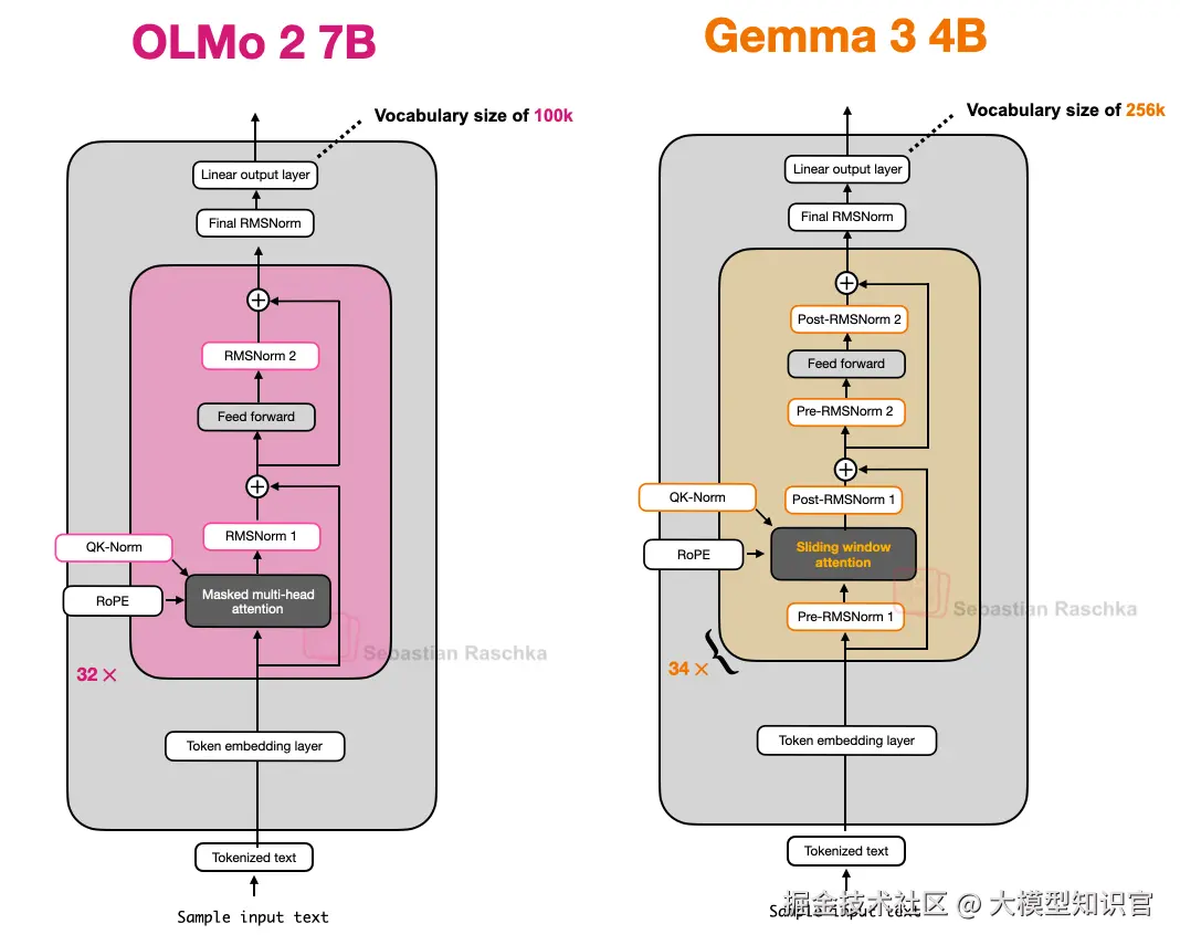 OLMo2 与 Gemma 3 的架构对比;注意 Gemma 3 中额外的归一化层