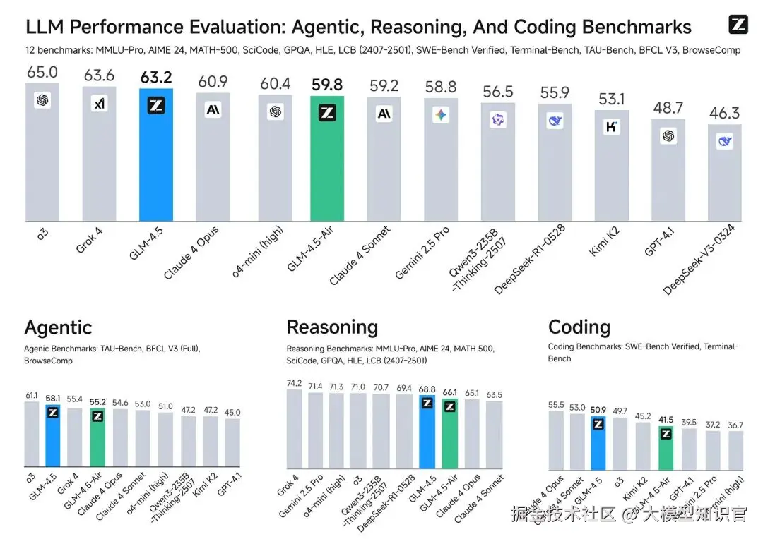 图来自官方 GitHub 仓库 github.com/zai-org/GLM… 的 GLM-4.5 基准测试。
