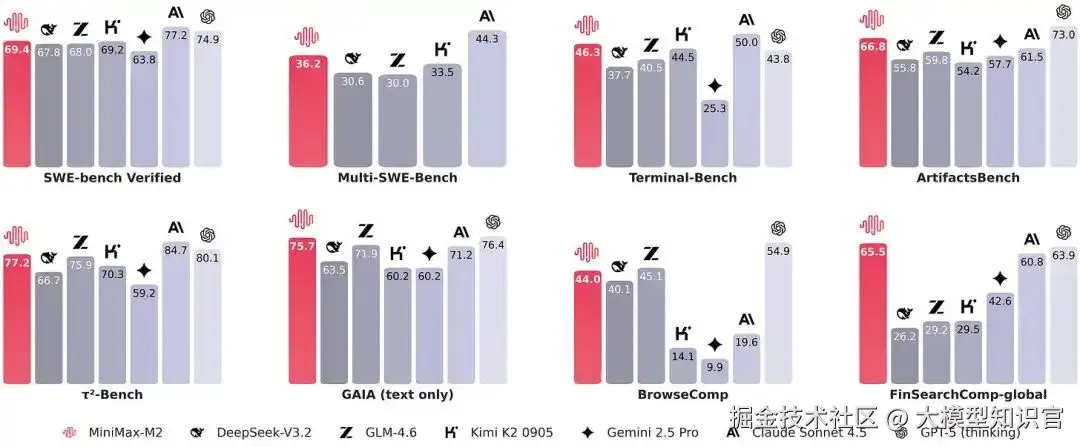 MiniMax-M2 与其他流行的开源权重和专有 LLM 的基准性能比较