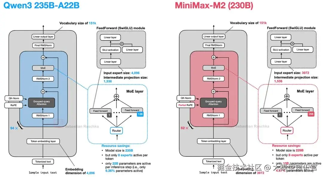 总体而言,MiniMax-M2 与 Qwen3 惊人地相似。除了改变层数、大小等之外,它总体上使用了相同的组件。