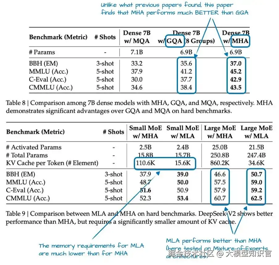 值得一提的是,MLA 并非 DeepSeek V3 首创,其前代 DeepSeek-V2 已引入并使用了该技术。此外,V2 论文中包含几项有趣的消融研究,或许能解释 DeepSeek 团队为何选择 MLA 而非 GQA(见下图)。