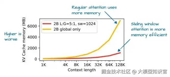 例如,Gemma 2 使用混合注意力机制,滑动窗口(局部)与全局注意力比例为 1:1,每个 token 可关注附近 4k token 的上下文。