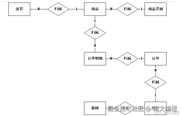 (8)系统包含以下7个实体,用户实体,商品类别实体,商品实体,进货实体,订单实体,订单明细实体,公告实体,ER图所示: