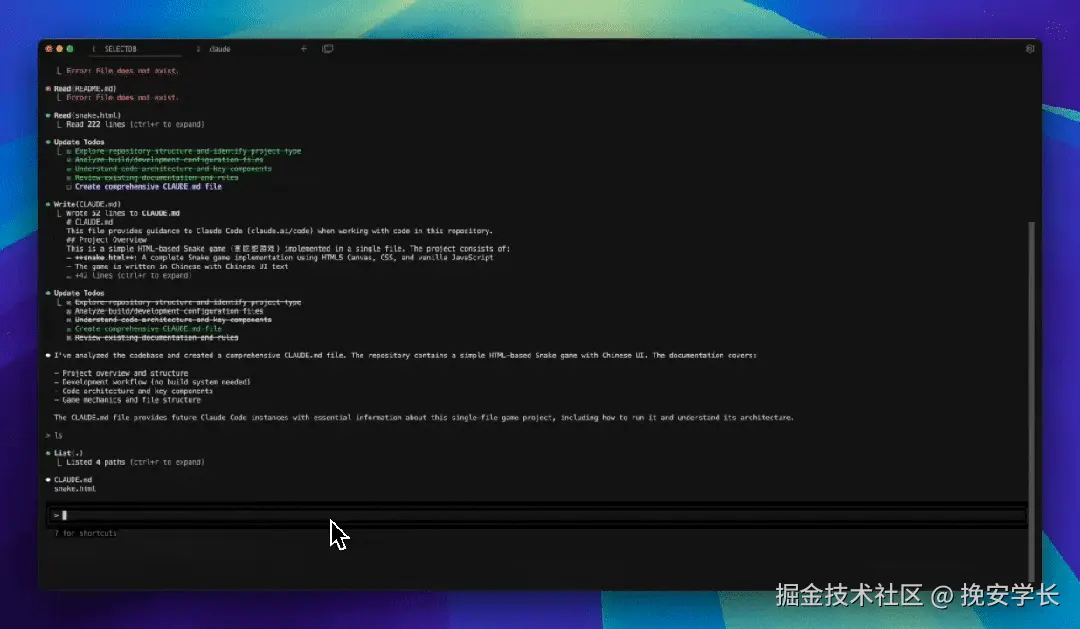 当你接手一个全新的、陌生的项目时,这个指令非常有用。它会命令Claude Code分析整个项目,然后自动为你生成一份CLAUDE.md文件,里面包含了项目概述、技术栈、关键文件等核心信息,能帮你快速建立对项目的整体认知。